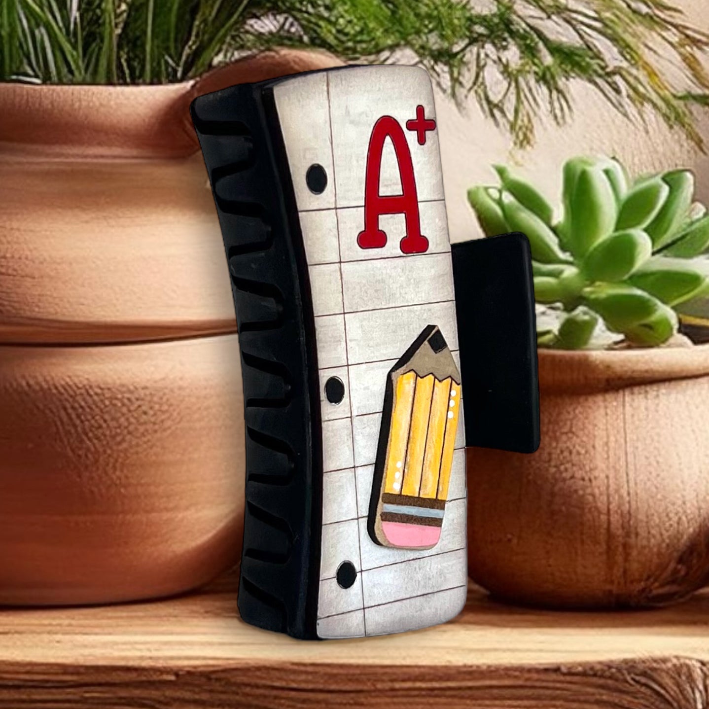 Show appreciation for your favorite educator with our 'A+ Teacher' 4 inch hair clip. This stylish and meaningful accessory is the perfect gift for teachers, celebrating their hard work and dedication in a chic, wearable way.