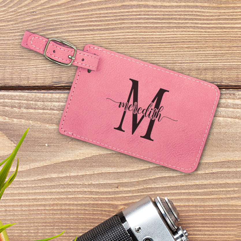 Travel in style with a custom engraved leatherette luggage tag!